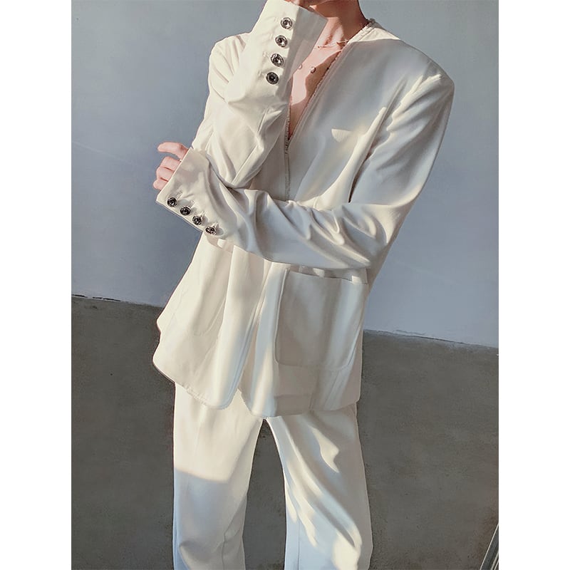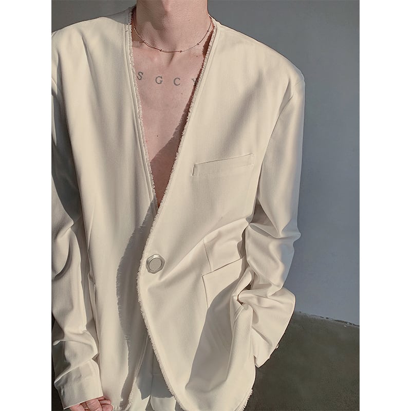 ピュアホワイト メンズ ビッグVネック ブレザー ローエッジデザイン